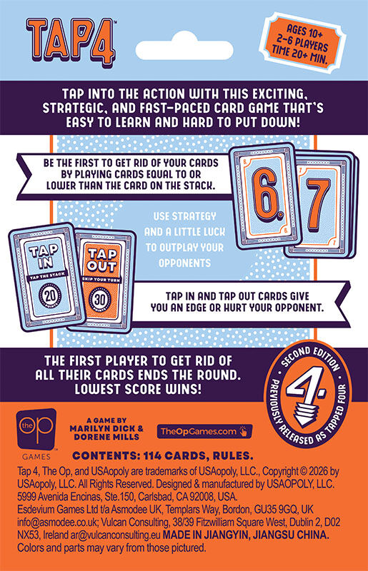 TAP into the fun with this exciting, strategic, and fast-paced card game that's easy to learn and hard to put down! Designed by a couple of grandmas from Idaho, the game (then called Tapped 4) spread by word of mouth from family to friends and on to complete strangers eventually selling hundreds of thousands of games around the country.